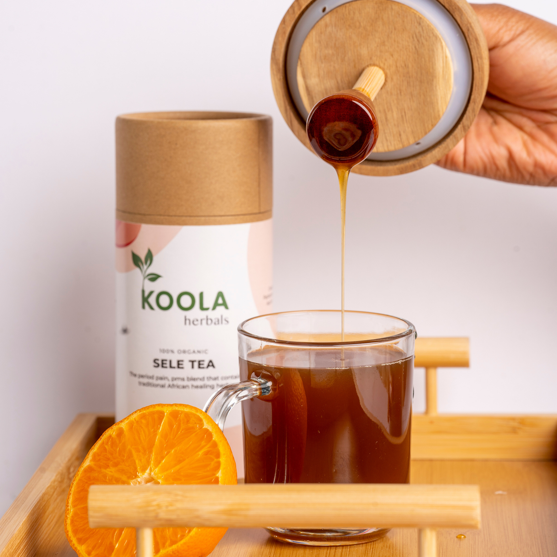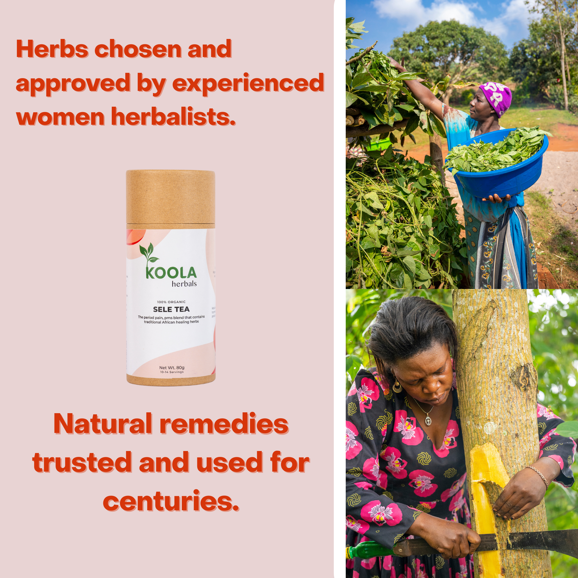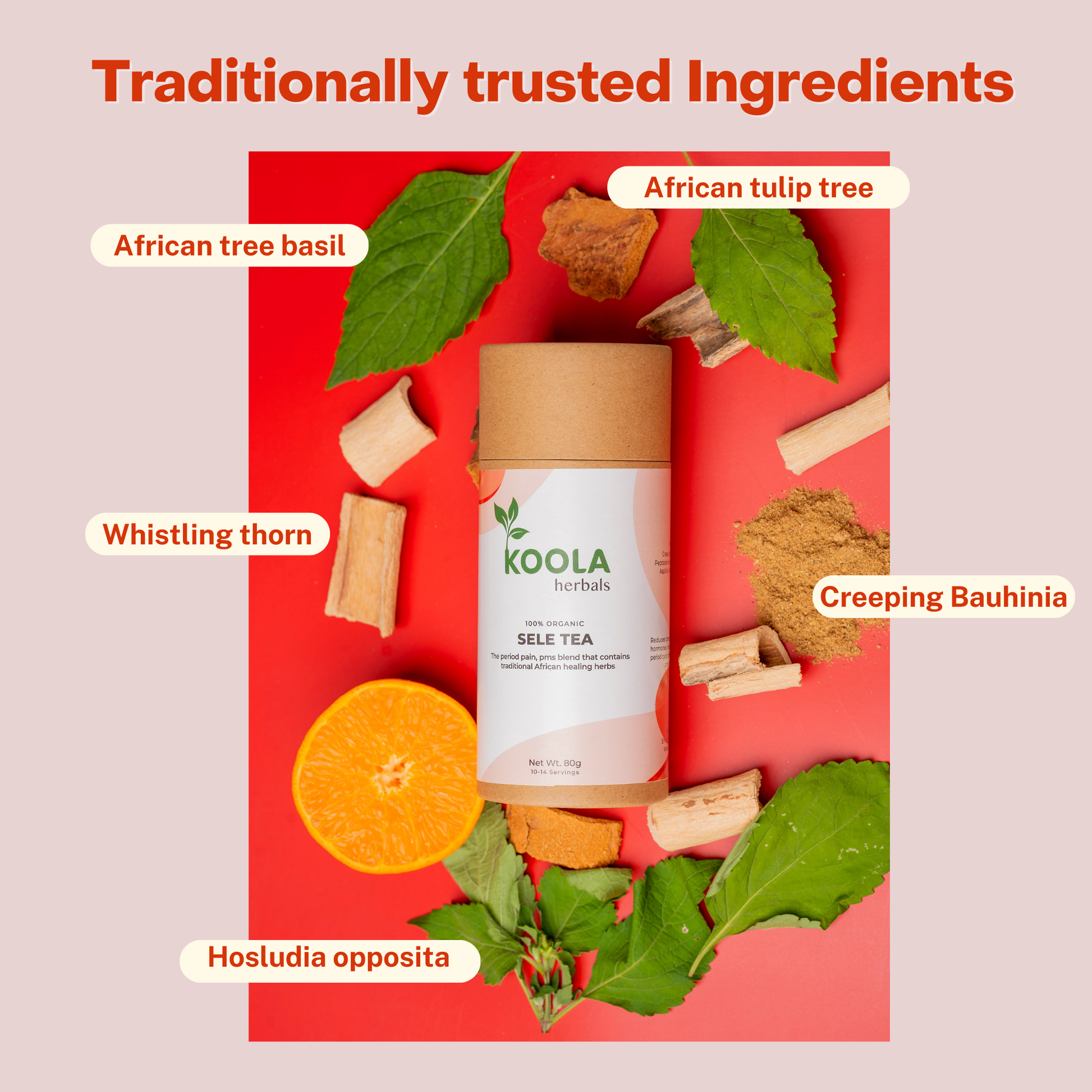 Sele Tea gebruikt Guava leaves, African Tree Basil, en Black Jack om vochtophoping te verminderen, de maag te kalmeren en spanning te verzachten, wat verlichting brengt tijdens de dagen voor en tijdens de eerste menstruatie.